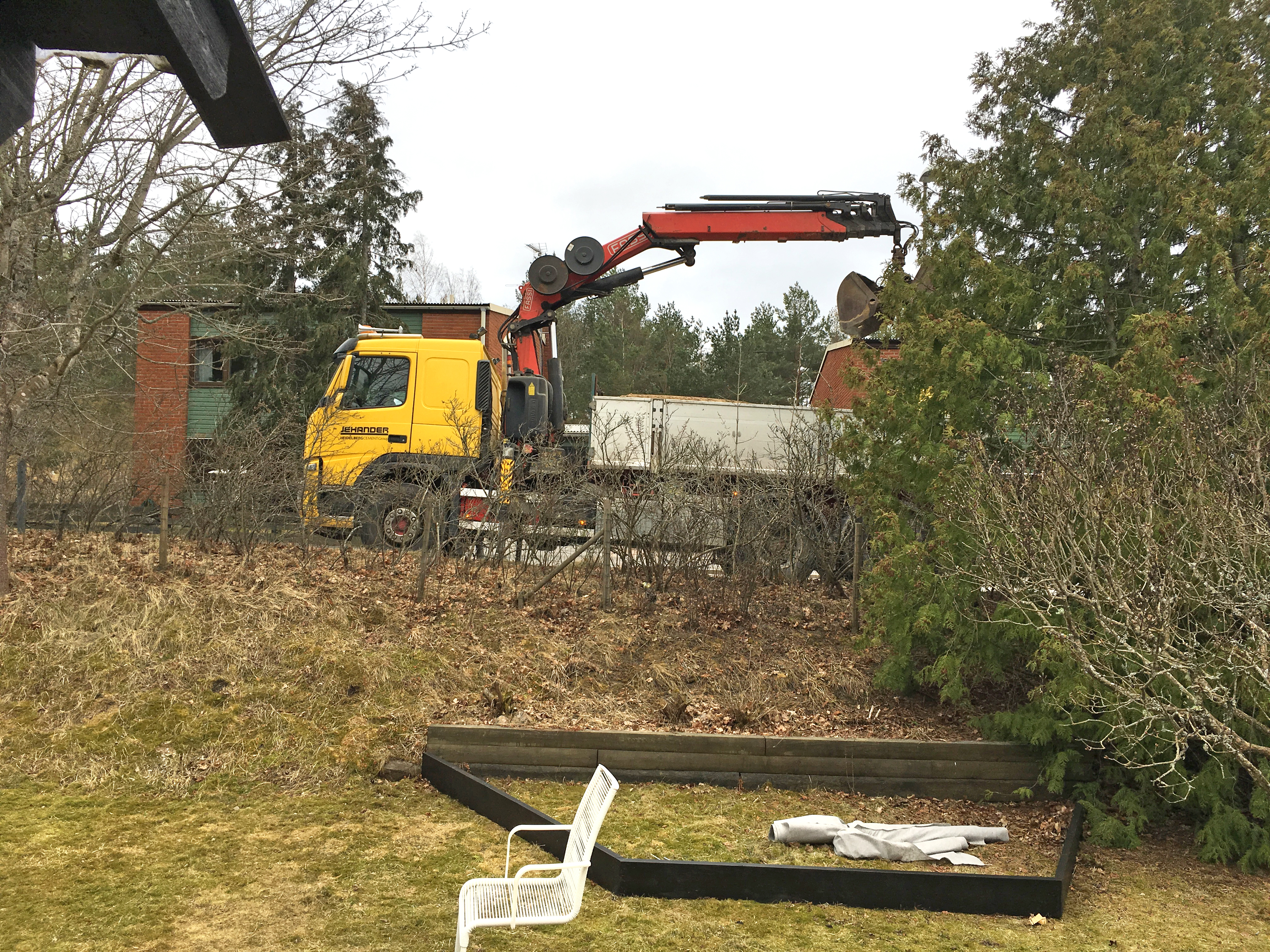 – Jag ringde till Jehanders kundtjänst och bad om en storsäck sand på måndagen. Redan nästa dag kom en bil och lyfte med kran över 1,5 ton sand i trädgården. Jag slapp kånka men fick såklart skyffla en del, berättar Tobias Westin.